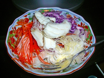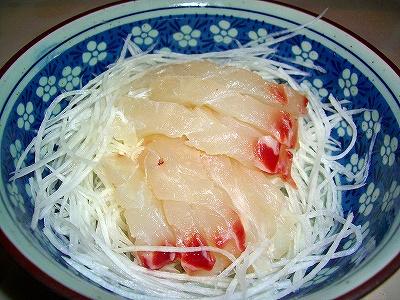 これは、私の深夜のおやつ用です。軽く湯引きした鯛を数きれ盛り付けしポン酢を掛け頂きます。