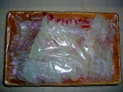 これも深夜の私のおやつ分ですが、パーシャル(−3度)の温度帯がベストですね。チルドのタイプ搭載の冷蔵庫をお持ちの方は、チルド室の冷気の噴出し部分に近ずけておけばOKですね。今回は、刺身包丁が研いでないのかかなり切れが悪い部分がありました。お恥ずかしい次第です。