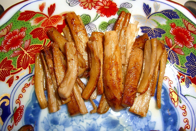 ★兎に角、この酒の肴、しいたけの軸ゴマ油いためはですね、しいたけの軸が松茸の歯応えに変身するんです。そして、ゴマ油を使うことによって何と風味も松茸の様になるんです。